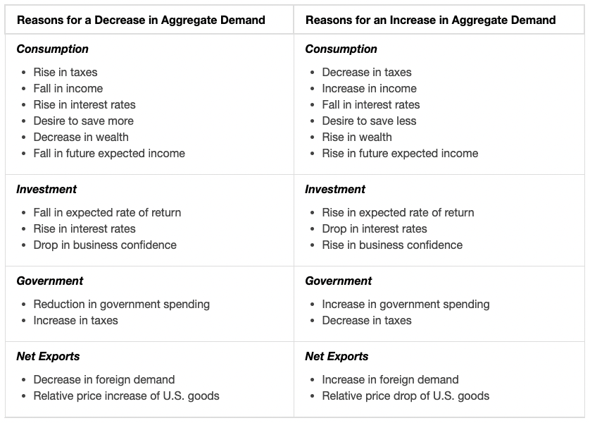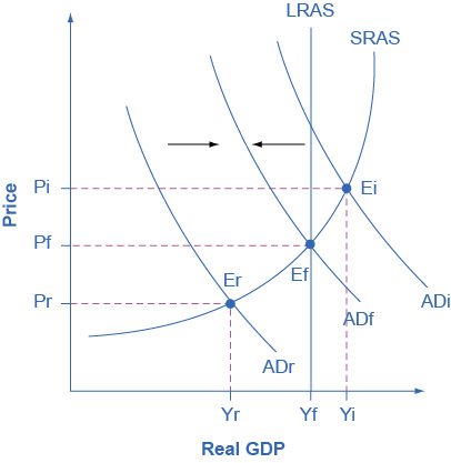 | Expansionary fiscal policy includes tax cuts and increased government spending to shift AD to the right. Contractionary fiscal policy includes tax increases and decreased government spending to shift AD to the left. |