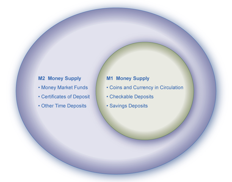 | The M1 supply consists of circulating currency and checking/savings accounts. The M2 supply includes money market funds, CODs, and other time deposits in addition to the M1 supply. |
