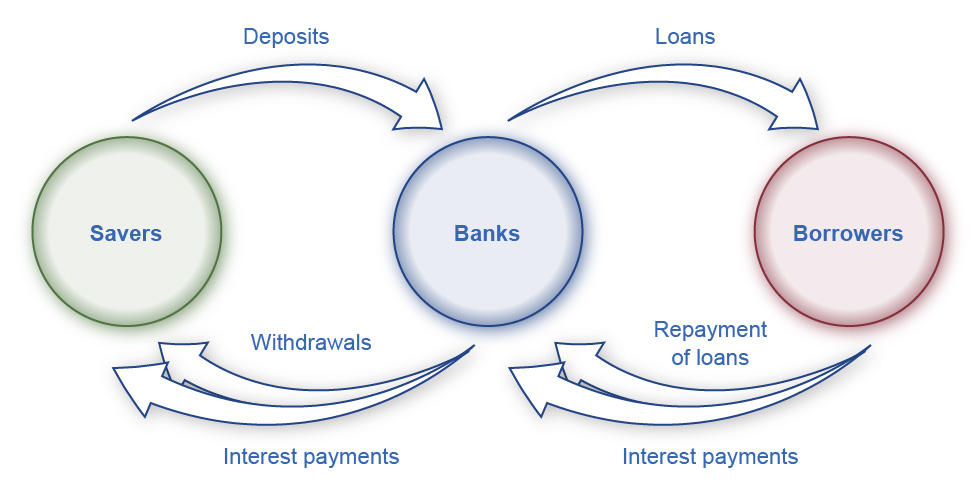 Payment systems facilitate the movement of money. When a borrower is looking for cash, banks can connect them with lenders for a transaction cost.