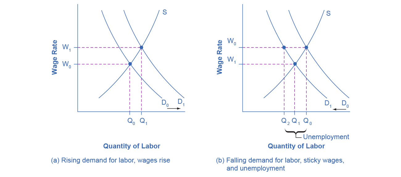 | Economists believe if wages fall in an economy, it happens slowly. Inflexible wages lead to short-run or long-run unemployment. |