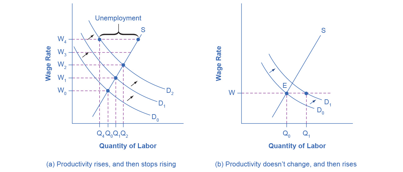 | Increased productivity leads to an outward demand shift, leading to an increased equilibrium wage. When productivity fails to increase at the same rate, the quantity demanded at the trending wage falls short of supply, resulting in unemployment. |